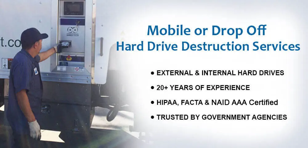 We also offer competitively priced hard drive destruction services to render your data 100% unrecoverable. We use state-of-the-art shredding technology to shred internal and external hard drives in just 3 seconds. Orange County customers are welcome to come to our shredding facility or have our mobile shred trucks go out to them. As with all of our destruction services, we will issue you a Certificate of Destruction with your hard drive’s unique barcard or serial number on it to prove that you are in compliance with all relevant privacy laws.