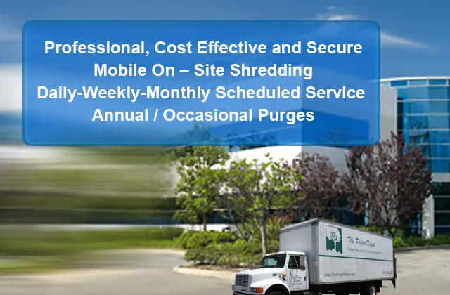For on-site shredding, we come to your location with our shredding truck and perform our secure destruction services there. In the case of regularly scheduled on-site shredding, we will have provided you with complimentary locked security containers beforehand that you'll keep in the office and deposit documents into whenever needed. You never need to remove paper clips, staples, binders or fasteners from your documents or sort paper. When we arrive at your facility at the scheduled time, our uniformed and screened employees will collect the containers and bring them to the shredding truck for immediate destruction of your documents.