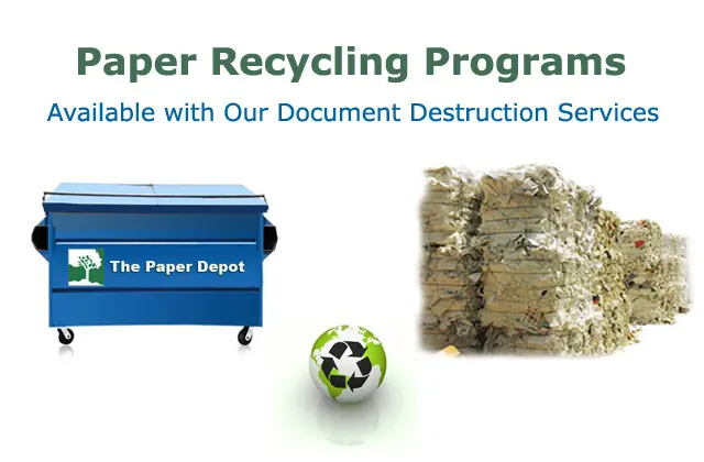 The Paper Depot's paper recycling programs* not only help the environment, they save you money and generate revenue for your business. Available to our document destruction clients, our paper recycling services help to lower your waste disposal costs and earn money back for your paper. In addition, paper recycling can help businesses meet green requirements set by municipalities or corporate guidelines, which may offer financial incentives.